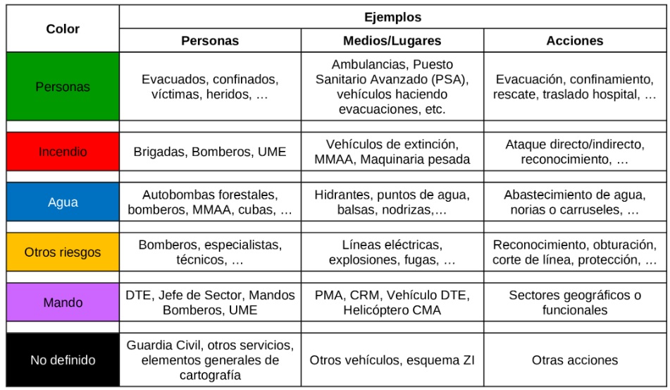 Se define un código de colores y una geometría de símbolos para que cualquier interviniente pueda interpretar un croquis o mapa, independientemente del dispositivo de origen. Cada servicio puede añadir simbología propia, pero debe respetar esta base común.