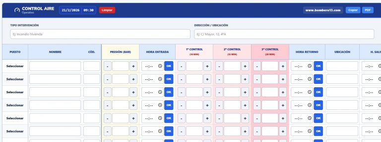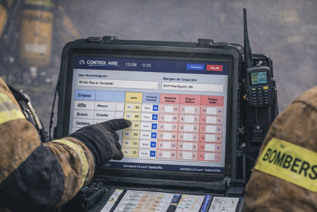 Mientras no exista una herramienta digital integrada en los equipos de respiración, este recurso puede mejorar las tradicionales pizarras villeda o anotaciones en papel, ofreciendo una interfaz limpia, estandarizada y accesible desde cualquier tablet o dispositivo táctil desplegado en el Puesto de Mando.
